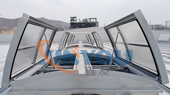 圓拱型電動采光排煙天窗是工業建筑屋頂常用的一種通風采光設施,主要材料通常采光不同規格的鋁型材,采光材料一般使用PC陽光板或FRP采光板,圓拱形的設計,外觀美觀大氣,能更好的防水,同時有效減少風壓阻力,可連接消防聯動控制系統及風、雨、煙感應器。天窗完全開啟時,排煙量***,***開啟角度為90°。