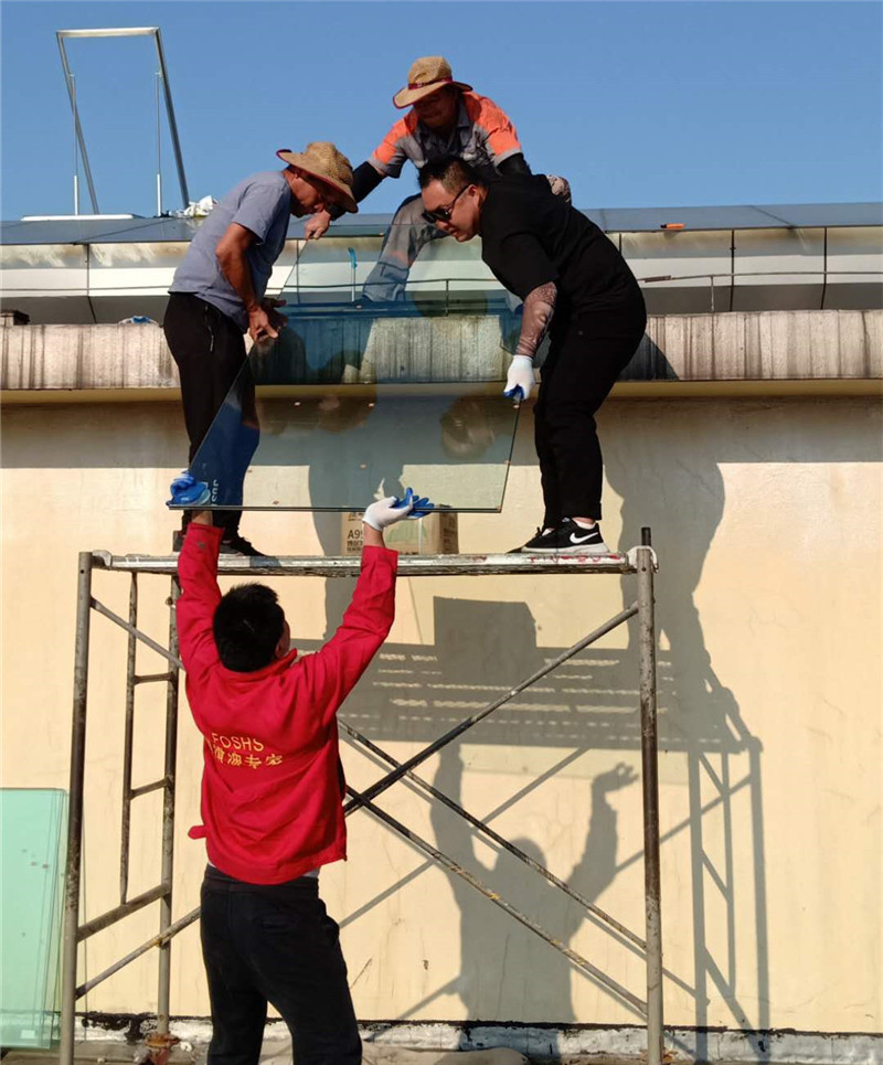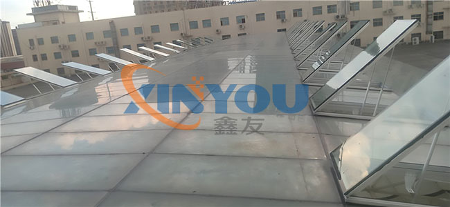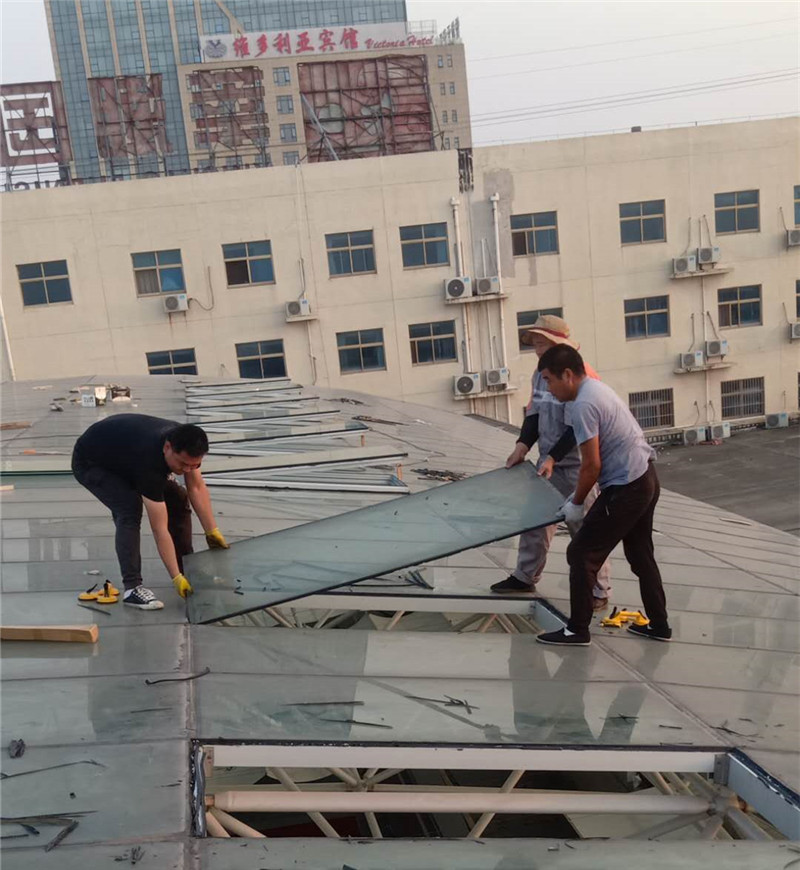 根據(jù)施工圖紙,需先將部分采光玻璃拆除,光滑的玻璃屋面給現(xiàn)場(chǎng)施工增加了難度。現(xiàn)場(chǎng)環(huán)境不允許大型作業(yè)車入場(chǎng)作業(yè),鑫友售后安裝部員工硬是憑自身力氣將一塊塊玻璃拆除,更換上鑫友電動(dòng)排煙窗。