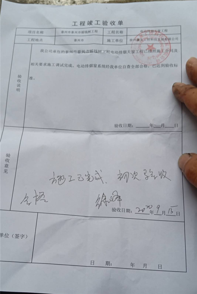9月15日,現(xiàn)場(chǎng)進(jìn)行了初步驗(yàn)收,所有電動(dòng)排煙天窗及配套設(shè)備運(yùn)行正常,達(dá)到驗(yàn)收標(biāo)準(zhǔn)!項(xiàng)目負(fù)責(zé)人簽寫工程驗(yàn)收單。
